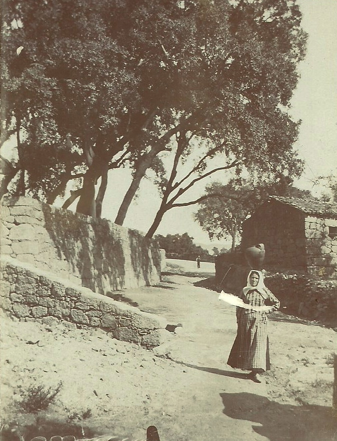 Bem que eu gostava!… Já andei a tentar descobrir o sítio. Palpita-me que a fotografia tenha sido tirada um pouco à frente da casa do Cartulho, que aquele muro grande de pedra seja o muro da Escola (nova), e que a estrada que se vê ao fundo seja a estrada da Estação (que bifurca para a Cortiçada). Nesse sítio faria sentido, porque até há ali uma bica (fontanário) de água. Isso explicaria o cântaro…